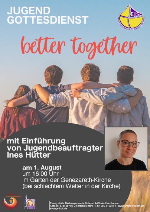 Am Sonntag feiern wir um 16 Uhr die Einführung von Ines Hütter, unserer neuen Jugendbeauftragten für Ober- und Unterschleißheim. Die Einführung findet in Unterschleißheim statt, entweder in der Genezarethkirche oder im Pfarrgarten bei der Genezarethkirche, Alleestraße 57 a. Wir freuen uns sehr, dass mit Ines Hütter neuer Schwung in die Jugendarbeit kommt.
