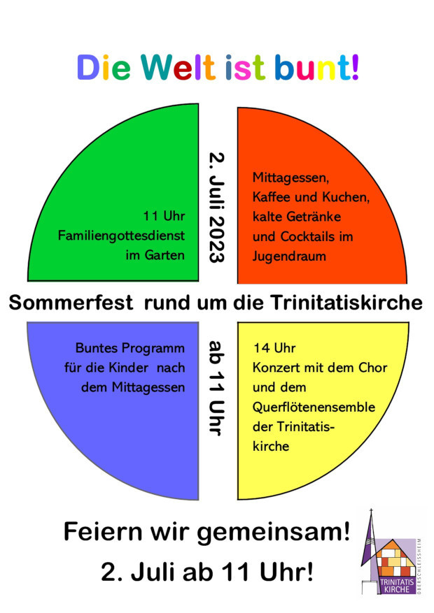 Am 2. Juli feiern wir unser Sommerfest! Unter dem Motto „Die Welt ist bunt“ gibt es ein buntes Programm, wir starten mit einem Familiengottesdienst um 11 Uhr bei hoffentlich schönem Wetter im großen Pfarrgarten, nach dem Mittagessen ist Zeit für ein kühles Bier im Schatten der Bäume, für viele Gespräche, für Kaffee und Kuchen.
